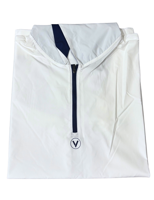 - White with inside navy hood & navy zipper