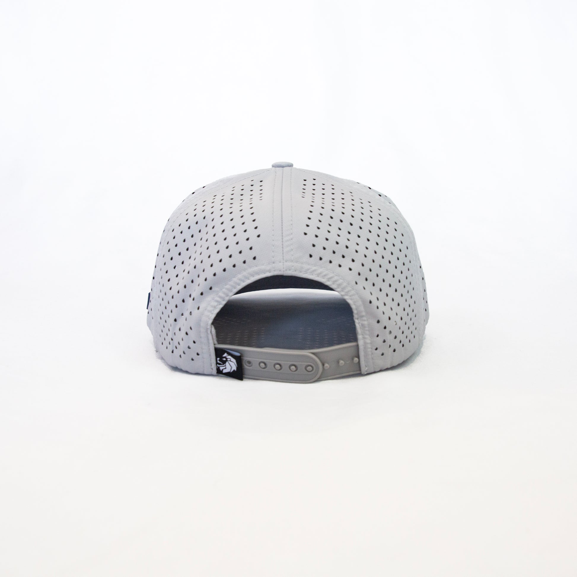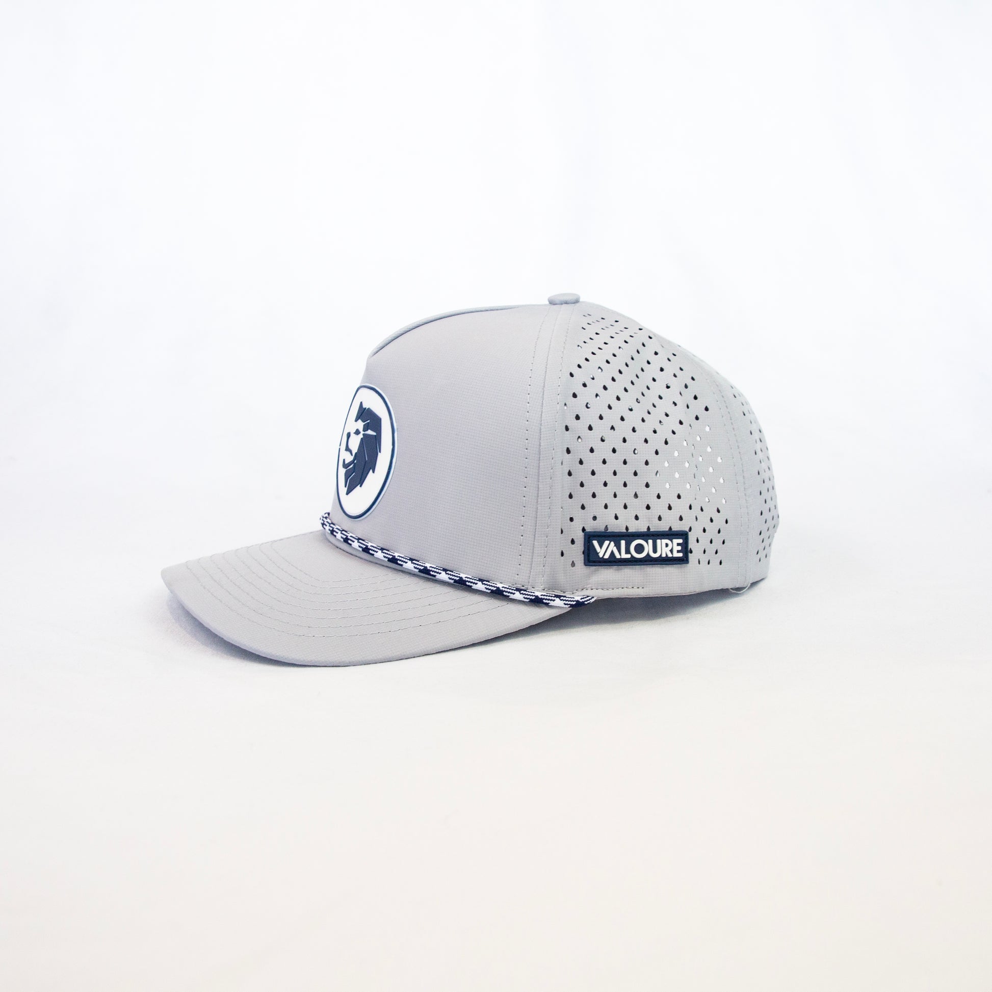 Stay cool while on the course in our modern golf hat. Made with a breathable, moisture-wicking fabric. A classic structured, 5 panel design with a mid-crown profile, and snapback closure for easy adjusting. Branded with a PVC Valoure Lion patch on the front, a small Valoure logo patch on the left side, and an added woven rope detail along the front panel.